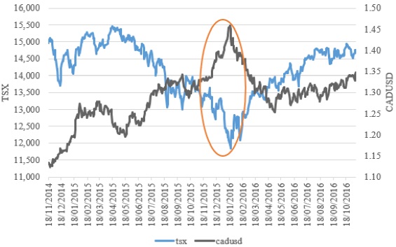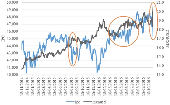 Once the Presidential campaign started, more often than not, when Trump’s campaign made any progress, the Mexican currency depreciated vis à vis the USD, and the IPC had a negative performance, but when Clinton’s electoral chances seemed improved, the opposite was true. As mentioned before, the effects over the corresponding Canadian variables were much less noticeable.