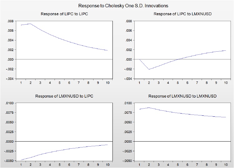 Finally, the impulse response graphical representation of the VECM models (Figure 3) shows that the response of a shock on the Mexican stock market index (LIPC) on itself vanishes away gradually, while its effect on the exchange rate (LMXUSD) first has a negative impact but five days later it is fully absorbed and, by day five, marginally enters into positive territory. In the case of a shock on the exchange rate, it initially affects the stock market negatively, and very gradually tends to disappear, after ten days. A shock on the exchange rate on itself remains present after ten days and tends to diminish very slowly.
