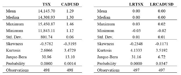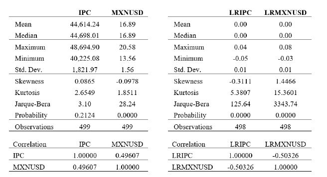 The market variables of interest are the main equity stock market indices of Mexico and Canada (IPC and TSX respectively), and their currency exchange rates versus the U.S. dollar (MXNUSD and CADUSD, respectively). All series were retrieved from Bloomberg’s database with daily frequency for the period 11/18/2014 to 11/10/2016. Data on the MXNUSD is quoted as the quantity of Mexican pesos per U.S. dollar; the same applies for the CADUSD, quoted as the quantity of Canadian dollars per U.S. dollar. The variables were log-transformed and their first-differences were obtained.
