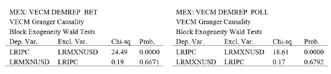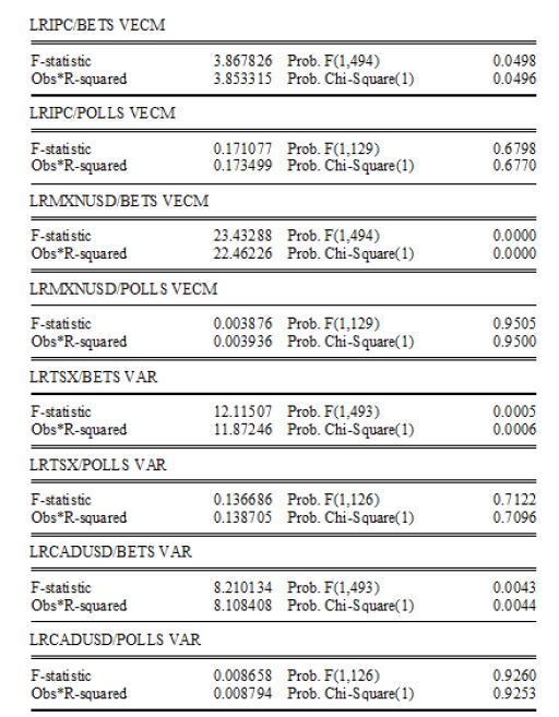 The Wald’s Exogeneity tests that follow are only reported for the VECM models for Mexico, since the VAR models for Canada show no significant explanatory power of bets or surveys on the behavior of the exchange rate and the stock market of that country during our sample period. According to Wald’s tests (Granger causality in the VECM), it may be concluded that the exchange rate causes the performance of the stock market index in the Granger sense, but not the other way around. This result applies both for the bets model and for the surveys model, since both reject that the LRMXNUSD coefficient in the equation of LRIPC, is zero as seen in the first part of Table 12.