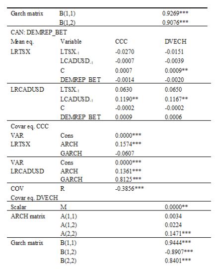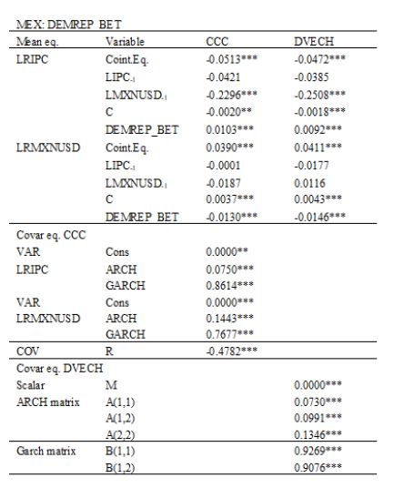 The interpretation of the results and conclusions regarding the variables of the prediction (bets) market in terms of the sign and significance, remain the same using GARCH CCC as DVECH. An increase in the probability of electing the candidate of the Republican Party (measured through bets quotations) has a clearly negative effect both on the Mexican stock exchange (lower level) as well as in the Mexican currency exchange rate (it depreciates vis à vis the USD). The GARCH CCC and GARCH DVECH models estimates for both countries using predictions markets (bets quotations) as exogenous variables are developed in Table 11.