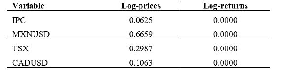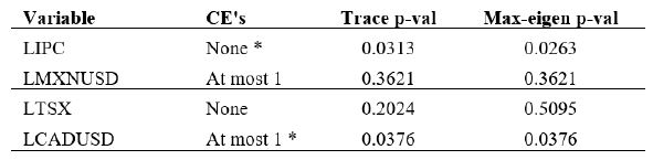 Table 4 shows the results of the Johansen Cointegration Tests for the Canadian and Mexican financial variables, for a linear deterministic trend (i.e., with intercept in the cointegrating vector). The cointegration tests results for the Mexican LIPC and the LMXNUSD indicate the existence of one cointegrating vector according to both, the Trace p-value test and the maximum eigenvalue test. Surprisingly, no cointegrating relationship is detected for the Canadian LTSX and the LCADUSD in neither of the two cointegration tests.