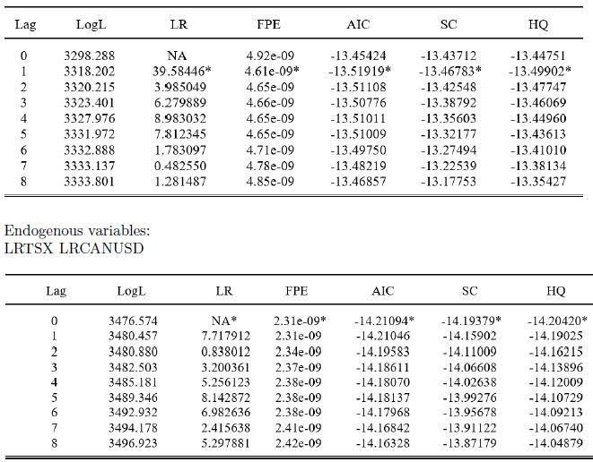 The lag order selection criteria for both models was obtained and is reported below. All the length of lag criteria indicate that one lag is optimal in the case of the LRIPC and LRMXNUSD model. In the case of the LRSTX and LRCA-DUSD the optimal lag according to the information criteria is zero. However, we implement a one lag basic model in this case too since the values of the criteria are very close, as shown in Table 5.