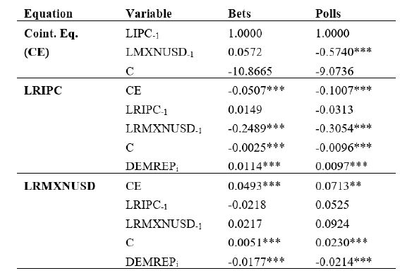 Consequently, we conclude that to focus on the empirical evidence at hand, both polls and prediction markets data can be used interchangeably as measures of the subjective probabilities of a Republican or a Democratic winner on the 2016 USA Presidential election. While our work does not represent a contribution to the attempts to clarify which of the two is more reliable, we do find these ex-ante predictors were highly significant in explaining the behavior of the IPC Index and the MXN/USD during the campaign period, and not in the case of the TSX and the CADUSD.