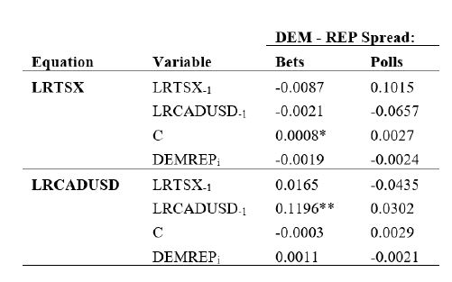 Table 7 reports a similar analysis for the Canadian financial variables. This time no cointegrating term was found, hence the equations are modeled as un-restricted VARs. Canada’ marginally greater international-trade diversification and the larger size of its economy should make that country’s financial variables less sensitive to the events of the USA Presidential campaign. In effect, our econometric results show there was no significant impact at all. None of the four models’ results present any statistical significance for any of the electoral preferences proxy variables and only one of the variables in the regression of LRCADUSD against bets, the lag of the exchange rate (LRCADUSD-1), was significant at 5 %.