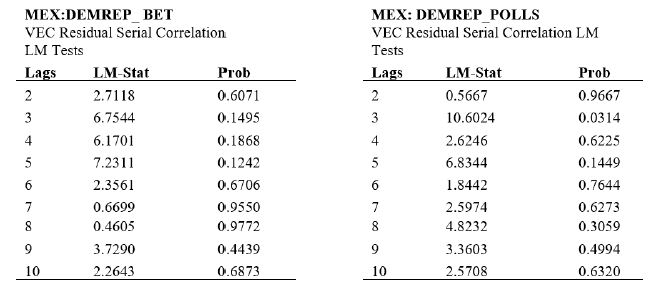 The serial correlation LM tests show and absence of autocorrelation in the first ten lags, both for the Mexican markets regressions (VECM) as well as for the Canadian market regressions (VAR), as shown in Table 8.