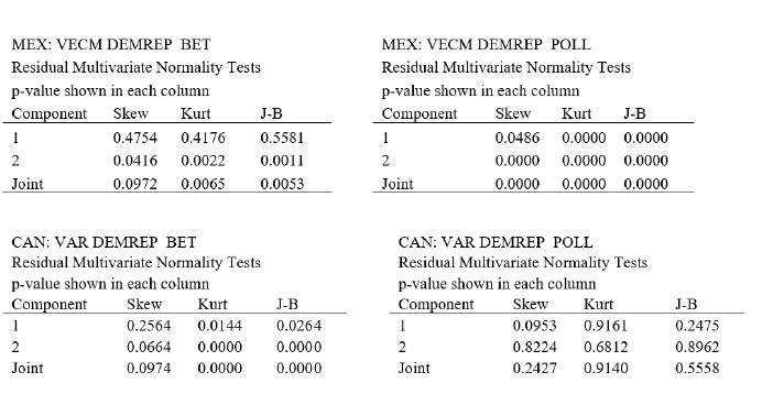 Jarque-Bera tests show that the residuals are not statistically normal in three of the four cases, mainly due to a high kurtosis (the test is not rejected for skewness), as reported in Table 9. This is a stylized fact in financial series. Only in the case of Canada’s VAR model, using Polls data as regressors, the residuals are multivariate normal. While the non-normality of the residuals means the estimators are consistent but not efficient, if the size of the sample is large enough, by the Central Limit Theorem, the confidence intervals obtained represent a good approximation to the real ones.