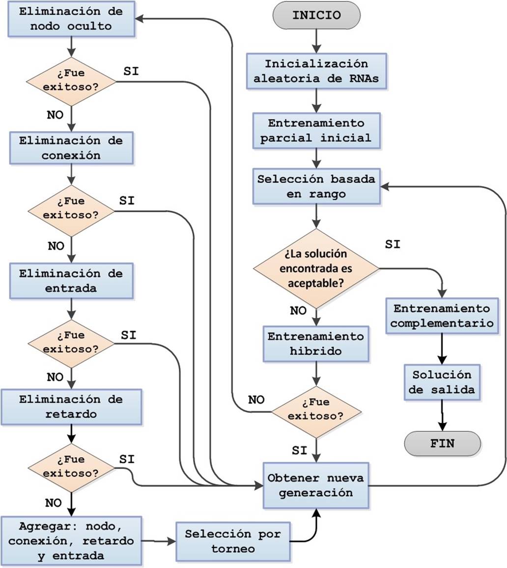 Los parámetros establecidos para esta investigación fueron los mismos para todos los modelos: tasa de aprendizaje 0.153, las mutaciones de los nodos ocultos y las conexiones entre 1 y 3, las mutaciones de entrada y de los retardos entre 1 y 2, el tamaño poblacional de 30 individuos, con 1,400 generaciones esperadas en el proceso evolutivo. No se emplearon criterios de interrupción temprana (early stopping) con el fin de evitar un sobre-entrenamiento de las RNAs, puesto que con base en experimentos previos, se infirió que no era necesario. Dada la complejidad de la tarea a resolver y también derivado de las pruebas preliminares, se estableció el número de épocas de entrenamiento parcial durante la evolución en 1,200 y de 3,600 al finalizar el proceso evolutivo.