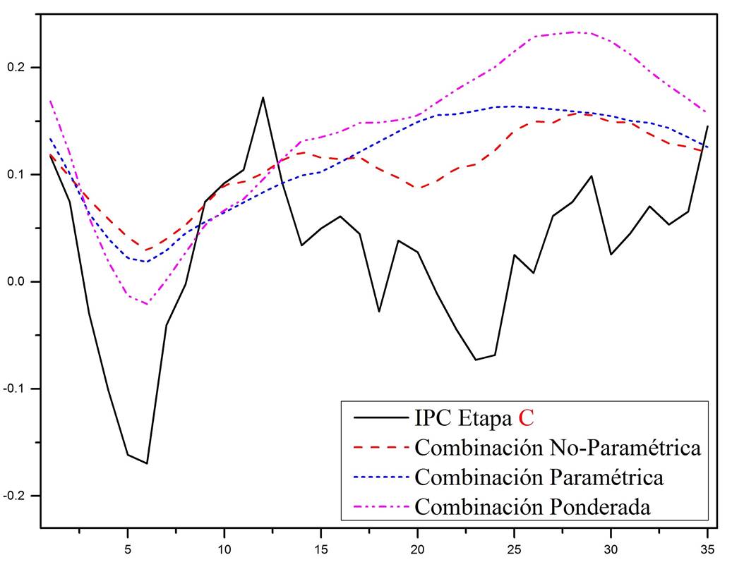 La Figura 9 ilustra el comportamiento de los modelos: combinación no-paramétrica, combinación paramétrica y combinación ponderada, así como también la ST del IPC, en el mismo periodo experimental llevado a cabo anteriormente en la fase B del pronóstico del IPC. A partir de una inspección visual de la Figura 9, se puede apreciar que la predicción producida por la CP por aproximadamente 12 días es el modelo que se ajusta mejor al periodo de la caída bursátil. La Tabla 6 confirma lo anteriormente ilustrado en la Figura 9, ya que muestra el rendimiento de los modelos predictivos para 5, 15 y 35 periodos de predicción. También, la misma Tabla expone cómo el modelo que mejor se ajusta a los datos en los primeros periodos es el modelo de CP. Sin embargo, para los 35 puntos de predicción, el error acumulado por la CP es el mayor de entre los modelos expuestos en la fase C del pronóstico del IPC.