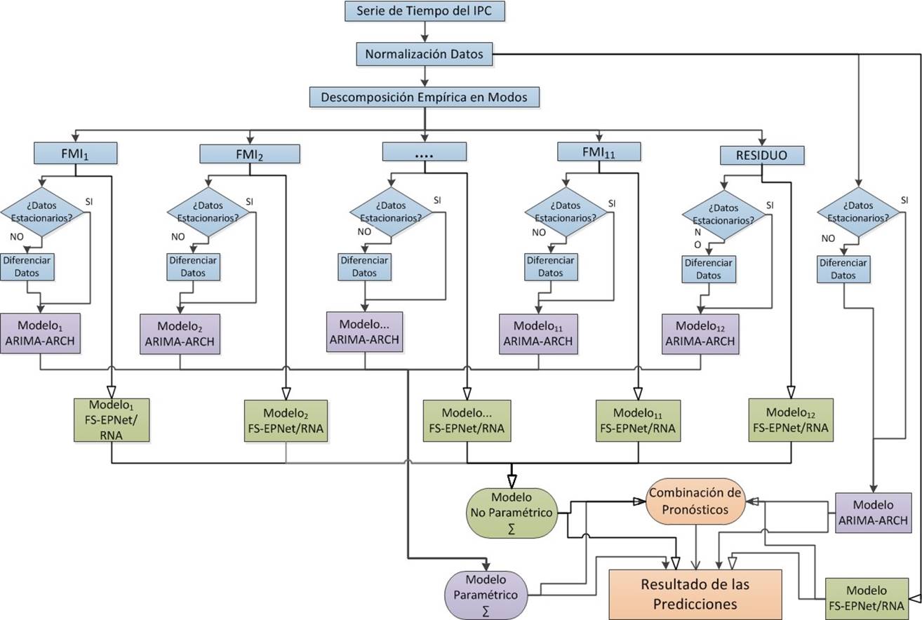 La Figura 2 ilustra la parte experimental de esta investigación, se utilizaron 4 sistemas, se diseñaron 2 modelos que trabajaron con la serie original del IPC, un modelo ARIMA-ARCH, así como también, un modelo no paramétrico de RNA diseñado mediante el algoritmo FS-EPNet. Posteriormente, los otros 2 sistemas tanto el paramétrico como el no paramétrico, que operaron con las FMIs y el residuo, edificaron para cada una de las descomposiciones un modelo ARIMA-ARCH. De igual forma, para cada FMI y su residuo se diseñó una RNA, donde cada una de las 11 FMIs y el residuo fueron pronosticados de manera individual en cada modelo (paramétrico y no paramétrico), finalmente se reconstruyó una predicción para cada modelo, mediante la suma de cada una de las descomposiciones pronosticadas, de manera que cada modelo produjo su propia predicción. De esta forma, se obtuvieron 4 pronósticos uno por cada sistema, los cuales fueron: 1) ARIMA-ARCH; 2) FS-EPNet/RNA; 3) DEM/ARIMA-ARCH; y 4) DEM/FS-EPNet/RNA.