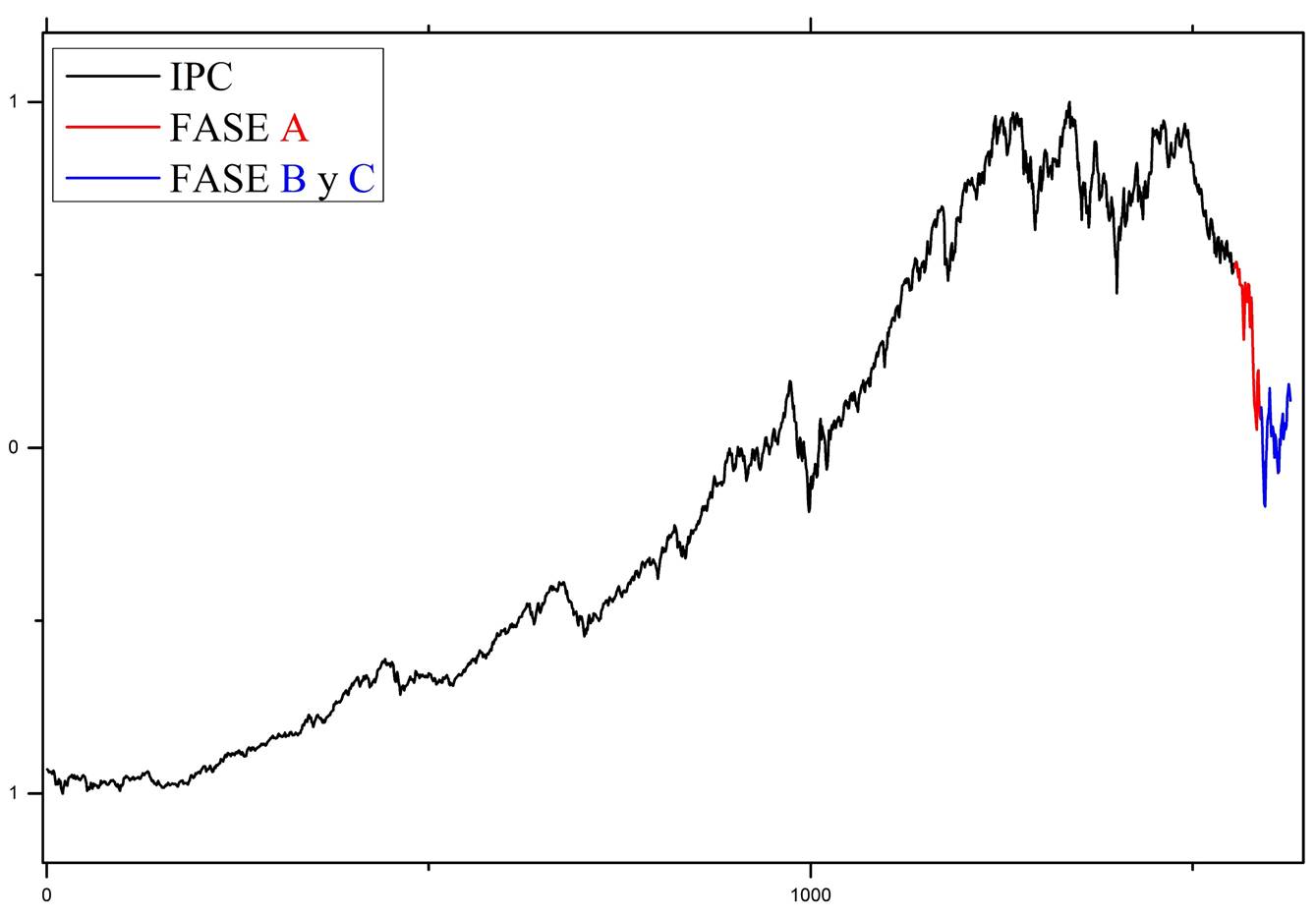 Por último, se combinaron las predicciones de los modelos DEM/ARIMA-ARCH y DEM/FS-EPNet/RNA para crear un único pronóstico. El experimento se dividió en 3 etapas, la fase A es la parte que se puede considerar como el pronóstico dentro de la muestra, y las fases B y C representan al pronóstico fuera de la muestra. Esta etapa de investigación se encuentra implicada específicamente en la predicción de la bolsa mexicana de valores (BMV), en un periodo de crisis. La muestra de datos analizada es la correspondiente al precio de cierre del IPC para el período comprendido entre el 08/07/2002 y el 16/12/2008 tomada de ADVFN (2018); se contabilizó un total de 1624 datos del IPC.