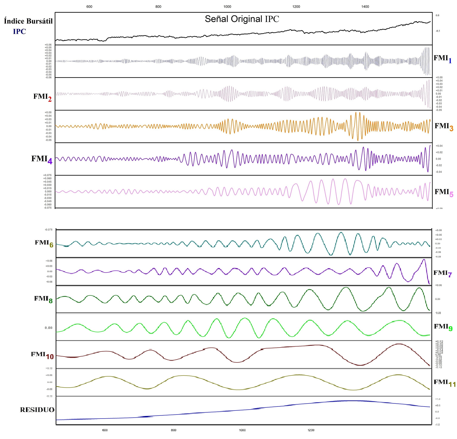 La Figura 4, muestra la serie original del IPC, así como las 12 descomposiciones resultantes al aplicarle la técnica DEM, de la descomposición se obtuvieron 11 FMIs y un elemento residual. Se ilustra cómo la primera FMI se distingue por contener oscilaciones rápidas y conforme avanza el proceso de cernido, las FMIs que se adquieren incluyen oscilaciones gradualmente más lentas hasta que se alcanza el residuo que tiene como característica ser una función monótona, a esta serie ya no se le puede extraer más información.