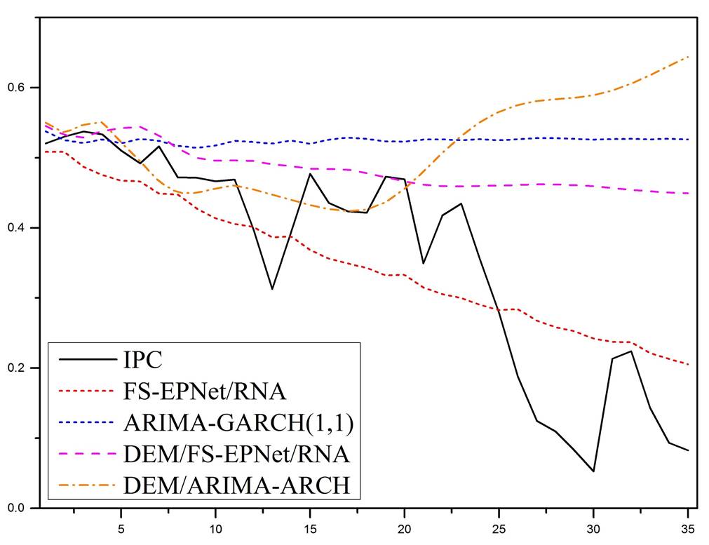 En esta fase se comparan los 4 modelos anteriormente descritos. En la Figura 5 se muestra el desempeño de los diferentes modelos propuestos para esta etapa. En tal Figura, se ilustra como el modelo paramétrico ARIMA-GARCH(1,1) es el modelo con el peor desempeño, además cabe destacar como el modelo DEM/ARIMA-ARCH después de aproximadamente 22 días de predicción tiene un desempeño muy errático. Por otra parte, es visible que el modelo FS-EPNet/RNA es el de mejor ajuste a los 35 días de pronóstico.