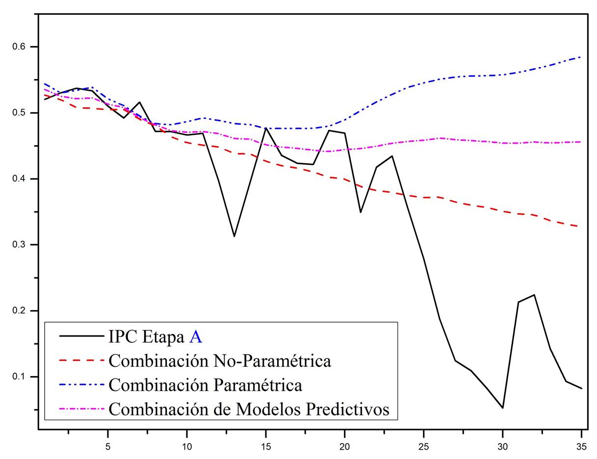 El segundo modelo combina al modelo paramétrico ARIMA-GARCH(1,1) y al modelo DEM/ARIMA-ARCH, el resultado de esta combinación produce una combinación paramétrica. La tercera y última combinación, llamada combinación de modelos predictivos, incluye la combinación no-paramétrica y la combinación paramétrica. La Tabla 2, muestra el comportamiento de las predicciones en un esquema de combinación con pesos igualitarios. La misma Tabla indica que para los 11 periodos, la predicción con un mejor desempeño es la combinación de modelos predictivos. Sin embargo, para los 35 periodos la combinación no-paramétrica es la predicción que posee el error más bajo en esta fase del IPC.