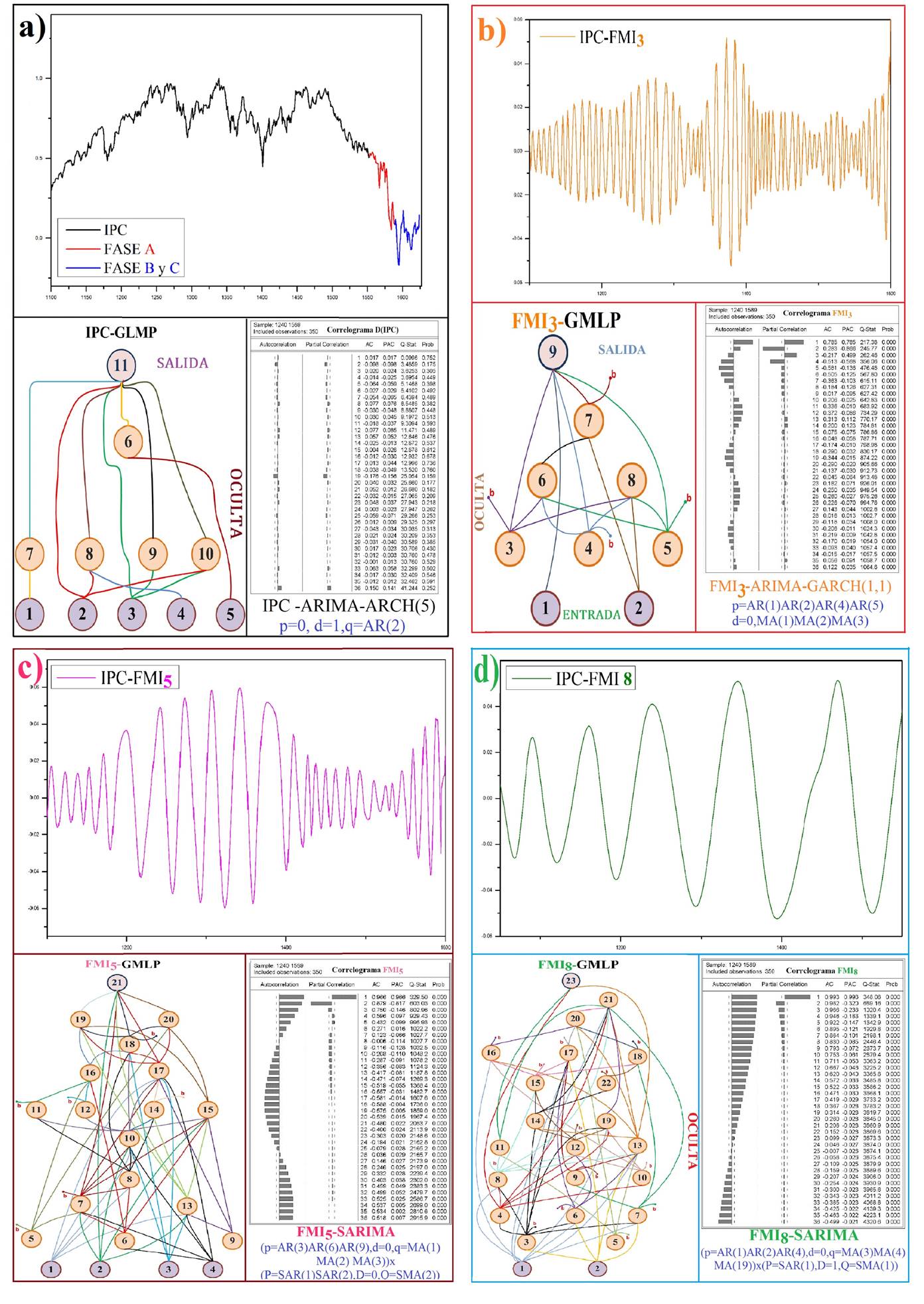 Otras investigaciones, como la mencionada anteriormente en la sección de revisión literaria en el trabajo realizado por Zorin Borisov (2002), se empleó con una arquitectura de RNA con: 59 neuronas de entrada y 35 neuronas ocultas. Dicha diferencia entre ambos diseños arquitectónicos, a pesar de que no resuelven la misma tarea estas dos RNAs, puede otorgar un atisbo de las dimensiones tan compactas que puede lograr diseñar el algoritmo FS-EPNet. Además, la Figura 7 en cada recuadro ilustra por cuestiones de apreciación un fragmento de la serie a resolver, la topología de la RNA encargada de solucionar la tarea, así como también el correlograma de dicha serie y el modelo paramétrico que mejor se ajustó a los datos. Cabe mencionar, que en la Figura 7a se muestra la serie original del IPC, así como su correspondiente correlograma, donde es posible apreciar la dificultad de encontrar patrones a esta serie mediante este gráfico de autocorrelacciones. Por el contrario, en la Figura 7b, 7c y 7d, los diferentes correlogramas de las FMIs muestran una mayor facilidad en la estimación de los parámetros del modelo ARIMA.