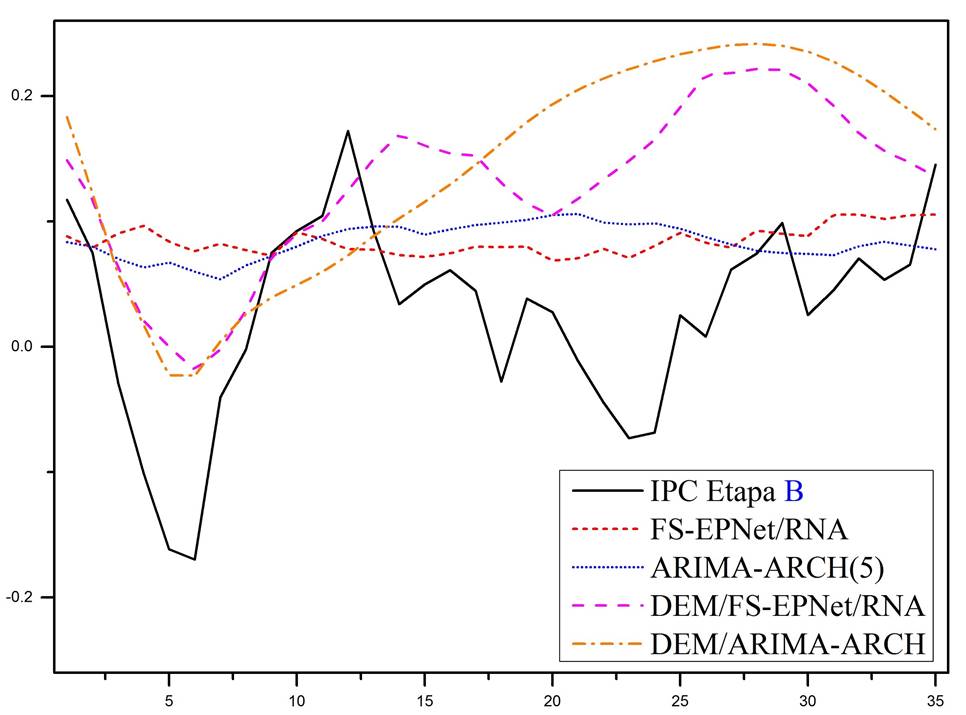 La predicción final de cada modelo se obtiene mediante la adición de cada una de las descomposiciones pronosticadas. Finalmente, se toma en cuenta lo que indica la literatura, “que una combinación de pronósticos conlleva a una predicción más precisa” (Adams, 1978; Makridakis et al., 1982; Bessler Chamberlain, 1987; Gonzales Luna, 2011). En lugar de sólo elegir la predicción producida por el modelo que se considere más apto. Por tal razón, en esta investigación se realiza una combinación de pronósticos, ya que se asume que cada modelo, dadas sus características, es capaz de capturar diferentes aspectos del fenómeno de una ST. Como consecuencia de lo anterior, se toma como premisa que el modelo ARIMA-ARCH es capaz de capturar de manera más adecuada la dinámica lineal. Por otro lado, se presupone que un modelo de RNA se puede emplear para modelar, comprender y asimilar el comportamiento no lineal del mercado bursátil, más aún al usar la DEM.