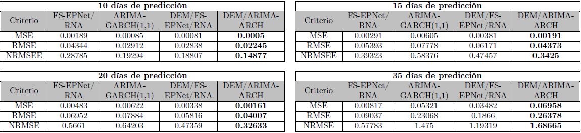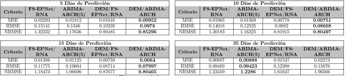 La Tabla 1, indica que para los 10, 15 y 20 periodos, el modelo que mejor se ajusta a los datos es el DEM/ARIMA-ARCH y que para los 35 periodos, el modelo FS-EPNet/RNA tiene un error menor.