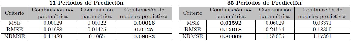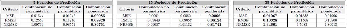 Los métodos de combinación propuestos y utilizados en esta fase o etapa son: la combinación ponderada (CP) y el promedio simple (PS). La CP se basa en la estrategia propuesta por Granger Ramanatha (1984), donde los modelos utilizan un sistema de ponderación de combinaciones con pesos muy cercanos a la igualdad y se encuentra restringida la suma de pesos de los modelos a combinar a la unidad. Por lo tanto, la medida que se eligió fue el periodo de 11 pasos hacia adelante del criterio NRMSE, ya que en dicho periodo el error de ambos modelos es muy cercano uno del otro.