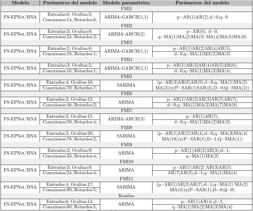 Para producir las predicciones del modelo DEM/FS-EPNet/RNA, se promedió a los cinco individuos mejor clasificados tomando como base el criterio de desempeño NRMSE en cada descomposición para ser parte de la reconstrucción. Es decir, de entre 12 ejecuciones independientes se eligieron los resultados provenientes de las cinco redes neuronales que obtuvieron el error menor en la predicción del conjunto final de prueba para cada FMI y el residuo. El resultado de la predicción de estas cinco RNAs elegidas a su vez se promedió para obtener una sola predicción por cada descomposición.