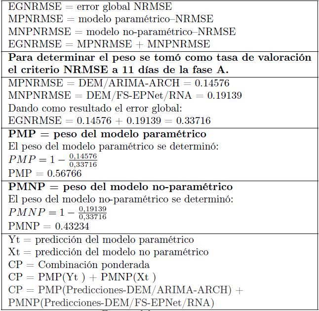 Las predicciones que se incluyen en la CP son los derivados de los modelos paramétricos y no paramétricos que trabajaron en conjunto con la técnica de DEM. Para llevar a cabo la combinación, los pesos se determinaron con base en el rendimiento de los modelos de la etapa A. Para realizar la combinación ponderada, cada una de las predicciones de la fórmula DEM/ARIMA-ARCH se multiplicó por 0.56766 y para la fórmula DEM/FS-EPNet/RNA cada pronóstico se multiplicó por 0.43234. Posteriormente, ambas predicciones ponderadas son adicionadas y se obtiene como resultado la CP. Cabe recalcar que la suma de los coeficientes PMP + PMNP = 1 dan como resultado la unidad.