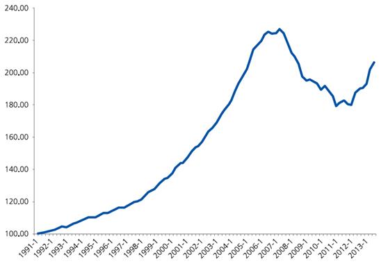 At the turn of the century, the crash of the NASDAQ, the stock market where most new technology firms are listed, was transmitted to the rest of the stock market and had a significant influence on the slow-down of economic activity in the United States. Moreover, during the following years, a series of financial scandals (e.g., Xerox and Tyco in the U.S.; and, Parmalat in Europe) caused further erosion in investors’ confidence and, naturally, motivated their search for alternative investments. In the short-run, many investors had lost trust in stocks and financial securities, so they redirected their cash investments towards the real estate market, which potentially promised extraordinary returns: property prices had increased at a compound annualized quarterly rate of 6.6% for the last 10 years (Figure 1). So, the residential sector became a preferred investment alternative.