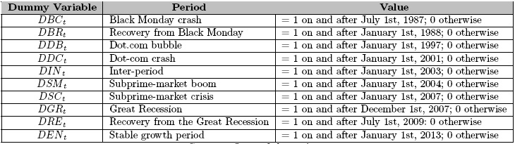 During periods of crisis, volatility is expected to increase. That is, the coefficients that correspond to a crisis, (Black Monday crash), (Dot.com crash), (Sub-prime market crisis) and (Great Recession) should have a negative sign. Similarly, volatility is also expected to increase during booms. In this case, those coefficients that correspond to boom periods are expected to be positive, (Dot.com bubble), (Dot.com bubble) and (Sub-prime market boom). During the period of recovery after a crisis, volatility is expected to decrease. So, the coefficients that correspond to the (Black Monday recovery), (Inter-period, after the dot.com bubble burst) and (Great Recession recovery) are expected to be negative. During periods of stable growth, volatility is expected to be lower. The coefficient that corresponds to the (stable growth period) is expected to be negative.