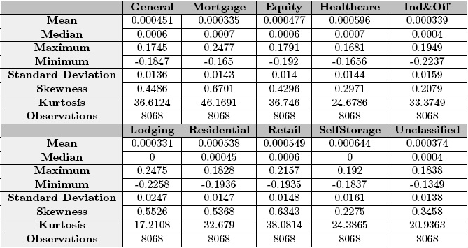 Table 2 shows basic REIT returns statistics. The mean daily return of the REITs indices is slightly different depending on the REIT. The lowest yields are observed for the lodging REIT (0.000331), the mortgage REIT (0.000335), the industrial and office REIT (0.000339), the unclassified REIT (0.000374) and the general REIT (0.000451). The most substantial mean daily yields correspond to the self-storage REIT (0.000644), healthcare REIT (0.000596), the residential REIT (0.000549) and the equity REIT (0.000477). The volatility, measured by the standard deviation of the REIT returns, is smaller for the general REIT index (0.0136), most likely due to the diversification effect. Other low volatility indexes include the unclassified REIT (0.0138), the equity REIT (0.0140), the mortgage REIT (0.0143), the healthcare REIT (0.0144) and the retail REIT (0.0148). Volatility is the largest for the lodging rate (0.0247), the self-storage REIT (0.0161), and the industrial and office REIT (0.0159). All REIT returns distributions are not normal, due to leptokurtosis and skewness to the right. Extreme values are also observed, with maximum daily returns of more than 15% and minimum daily returns below -12%.