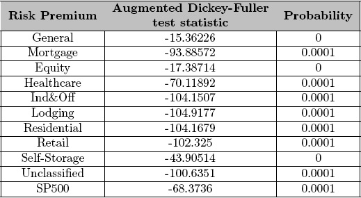 Table 3 shows the unit-root test using the Augmented Dickey-Fuller test on each REIT sector risk premium and the SP500 risk premium considering only a constant and a lag length selected using the Schwarz information criterion. In all of the analyzed risk premiums series, the hypothesis that the series has a unit root is rejected. Therefore, all risk premium series are stationary.