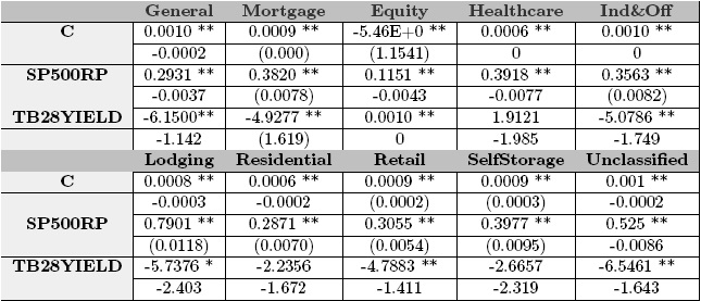 As expected, all REIT indexes show a negative dependence on the short-term interest rate (TB28YIELD). That relation is also statistically significant at 99% for almost all REIT returns, with the exception of lodging REIT returns, which have a coefficient on the TB28YIELD variable that is statistically significant at only 5%, and the healthcare and residential REIT returns that don´t show a statistically significant relation with TB28YIELD.