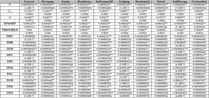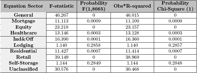 Table 5 shows the results of heteroskedasticity tests on the residuals of the regressions of each REIT risk premium series on the SP500 risk premium and the 28 treasury bills yields assuming a GARCH (1,1) model for the residuals volatility. The employed ARCH test is the Lagrange multiplier test for autoregressive conditional heteroskedasticity in the residuals (Engle, 1982). In Table, the F-statistic corresponds an omitted variable test for the joint significance of all lagged squared residuals. The Obs*R-squared statistic corresponds to the Engle’s LM test statistic. The tested null hypothesis is that the squared residuals do not depend on the previous period squared residuals. With one period lag, both the F-statistic and the Obs*R squared statistic of the ARCH-LM tests show the rejection at the 1% significance level of the null hypothesis in all analyzed sectors, except in the lodging and self-storage sectors, where the null hypothesis cannot be rejected at the 5% significance level. Therefore, all analyzed residual series, except in the lodging and self-storage equations, exhibit autoregressive conditional heteroskedasticity (ARCH effects).