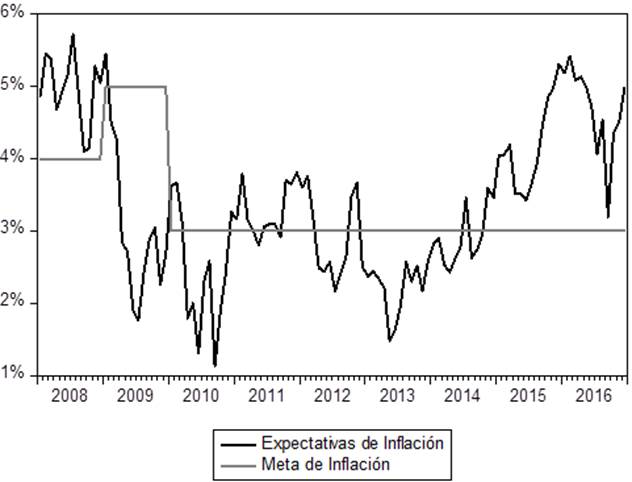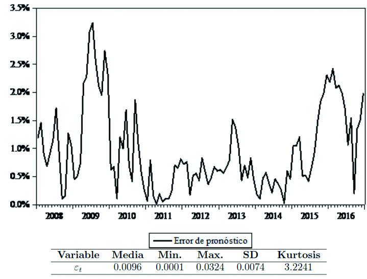 Por medio del comportamiento observado en la figura 2, es posible destacar tres períodos de desanclaje de las expectativas de inflación para el período analizado. Un primer período en el 2008-2010 donde el error de pronóstico fue en promedio de 1.2736%. Un segundo período entre 2011-2014 donde el error de pronóstico cayó y fue en promedio de 0.5008%. Finalmente, un tercer período entre finales de 2014 y 2016 donde las expectativas de inflación aumentaron y, como resultado, el error de pronóstico fue en promedio de 1.4216