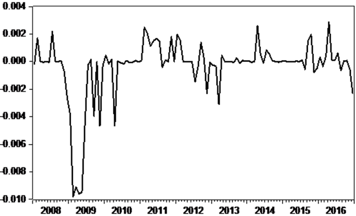Dado el método apuntado antes para medir la sorpresa monetaria, la variación de la tasa IBR entre los días en que es emitido el comunicado de prensa, es presentada en la figura 3. El componente inesperado de política monetaria se construye como la diferencia entre la tasa overnight el día en que el Banco Central se comunicó con el mercado financiero (día t) con relación a la tasa que existía el día anterior de la comunicación del banco central (día t-1). Los días en que el banco central anuncia sus decisiones fueron establecidas con base en el calendario publicado por la Junta Directiva del Banco Central. Cuando el comunicado de prensa es anunciado después del cierre de la bolsa de valores de Colombia, se fijó el día del comunicado para el siguiente día hábil. Acorde a la figura 3, la variación de la tasa IBR muestra que existe una reacción del mercado frente a los comunicados de prensa, lo que permite identificar componentes inesperados y efectos importantes sobre el mercado financiero una vez se ha realizado el anuncio por parte del banco central.