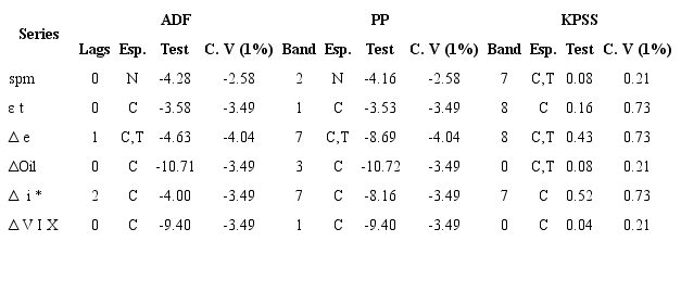 Antes de estimar la ecuación [4], es necesario adelantar los denominados test de raíz unitaria, Dickey-Fuller aumentado (ADF) y Phillips-Perron (PP) y un test de estacionariedad, Kwiatkowski-Phillips-Schmidt-Shin (KPSS), los cuales son presentadosen la tabla 3. Los tests (ADF, PP) fueron analizados con un nivel de significancia de 1%. En el caso del test KPSS, para que la serie sea definida estacionaria se comprobó significancia al 1%. El objetivo es contrastar los resultados de los test ADF yPP con los resultados obtenidos del KPSS. Cuando al menos dos de los test indica que la serie no tiene raíz unitaria, entonces la serie es considerada estacionaria. De acuerdo a las estimaciones obtenidas, se puede afirmar que las variables a utilizar en la ecuación [4] son todas I(0).