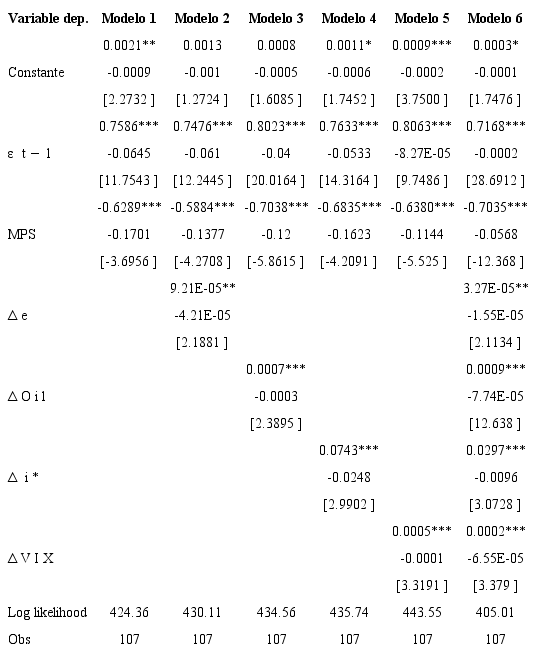 Por último, ya con relación al coeficiente del riesgo externo () los resultados encontrados muestran que la evidencia está acorde con la literatura. El coeficiente es positivo, lo cual muestra que el riesgo global, medido a través del VIX tiene el potencial de mover los mercados financieros de las economías emergentes, afectar las expectativas y ejercer influencia sobre el error de pronóstico. Un resultado similar es obtenido en De Pooter et al., (2014).
