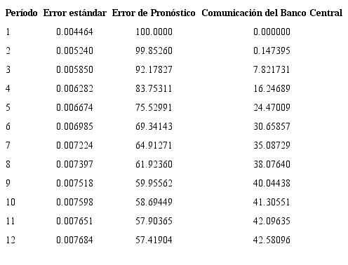 Como un complemento al análisis impulso-respuesta de la figura anterior, se realiza a continuación un análisis de descomposición de varianza. En la tabla 2 se presenta la descomposición de varianza de los errores de pronóstico ante una innovación en la comunicación y una innovación en los errores de pronóstico. Conforme puede ser observado, una innovación en la comunicación del banco central da cuenta por casi el 1.5% de la variación de los errores de pronóstico en el período inicial. El impacto de la comunicación se incrementa de forma monótona y al final del mes 12 explica el 42,5% de la varianza de los errores de pronóstico. En suma, la evidencia apunta a que la comunicación debe ser considerada al momento de analizar los errores de pronóstico de inflación en el mercado financiero.