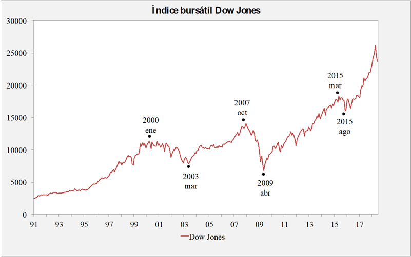 El índice bursátil Dow Jones, mide el desempeño de las 30 mayores empresas que cotizan en el mercado bursátil de Estados Unidos. En la Figura 1, se muestra la serie del DJ de noviembre de 1991 a abril de 2018, así también las fechas de inicio y finalización de los valles y picos de sus ciclos observables, determinados con el algoritmo de B&B. En particular, para este periodo, el DJ presenta tres periodos de recesión, asociados a las crisis: Burbuja Tecnológica (2001), Hipotecas subprime (2007) y Crisis del mercado financiero chino (2015), ver Tabla 3.
