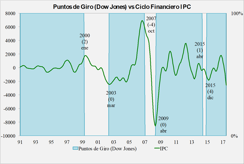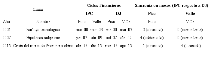 En términos de crisis financieras, se concluye que durante la crisis interna en México (1994) los ciclos del IPC anticiparon cuatro meses en promedio las recesiones y recuperaciones de los ciclos económicos mexicanos, y no así el DJ. Es decir, el IPC sigue siendo un importante referente de la actividad económica interna de México. Por otro lado, cuando acontecen crisis financieras globales, por ejemplo, durante las dos grandes crisis originadas en los Estados Unidos (2001 y 2007) los ciclos del DJ adelantaron con un promedio de siete meses los picos y cuatro meses lo valles de la economía mexicana. En el mismo sentido el índice DJ anticipó las recuperaciones del fechado del NBER de Estados Unidos. Por lo tanto, el DJ es un buen indicador para adelantar cambios en los ciclos económicos.