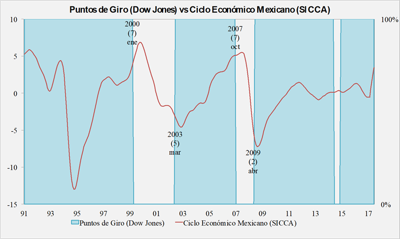 En la Figura 11 se muestran los ciclos económicos mexicanos obtenidos a partir del componente coincidente del SICCA, y se destaca en el fondo con cambios de barras los puntos de giro de los ciclos financieros del DJ para los Estados Unidos.
