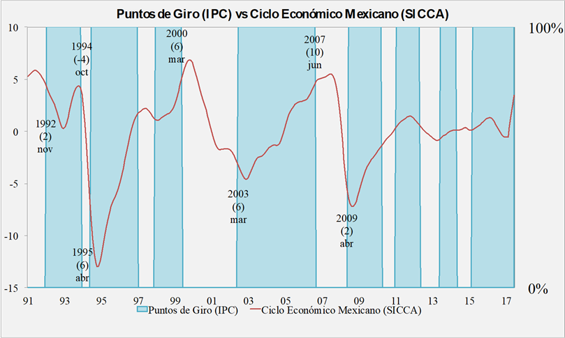 En la Figura 12 se muestran los ciclos económicos mexicanos obtenidos a partir del componente coincidente del SICCA, y se destaca en el fondo con cambios de barras los puntos de giro de los ciclos financieros del IPC.