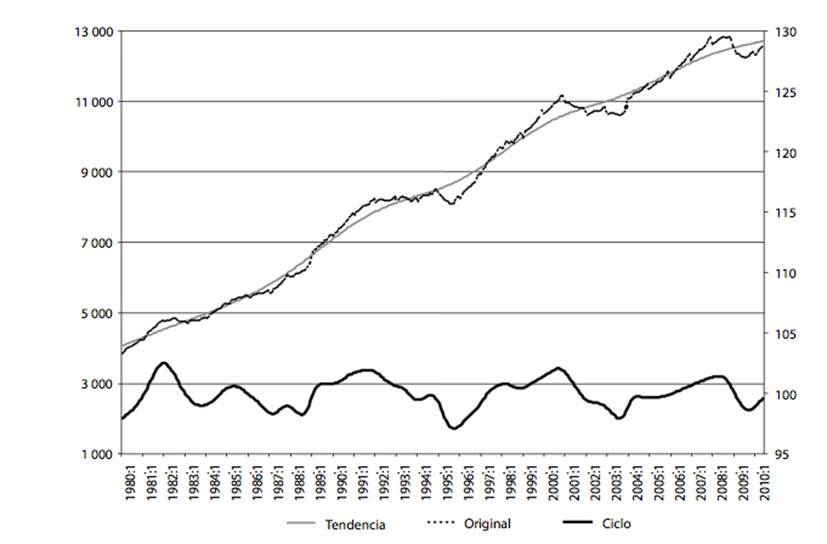 De acuerdo con Guerrero (2011) para descomponer una serie de tiempo en términos de ciclos económicos, debe hacerse el supuesto de que una serie de tiempo se puede descomponer en dos componentes o variables no observables: la tendencia, que muestra un comportamiento suave, asociado con un patrón de largo plazo; y el ciclo, que se define como las fluctuaciones obtenidas a partir de la diferencia entre los datos observados y su respectiva tendencia (Hodrick y Prescott, 1997).
