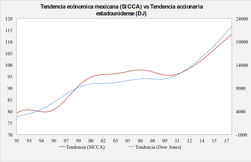 En este trabajo se obtuvieron dos conclusiones referente al análisis de las tendencias, la primera muestra la alta conformidad entre la tendencia del índice DJ y la tendencia del indicador coincidente del SICCA, comportamiento de largo plazo, éstas se expanden y contraen en los mismos periodos de tiempo. Esta actuación revela no solo la alta conformidad en términos de la series, sino también la elevada relación económico-financiera entre Estados Unidos y México, lo cual es un hecho ya conocido. Por otro lado, se observó que la tendencia del IPC presenta una sincronía mixta con respecto a la tendencia del indicador coincidente del SICCA, es decir, en ocasiones la tendencia accionaria mexicana de largo plazo no coincide con la dinámica económica nacional.