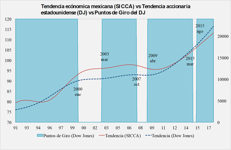 En la Figura 7 se muestra la tendencia económica mexicana obtenida a partir de la tendencia del componente coincidente del SICCA, la tendencia accionaria estadounidense a partir de la tendencia del DJ y se destaca en el fondo con cambios de barras los puntos de giro de los ciclos financieros del DJ.