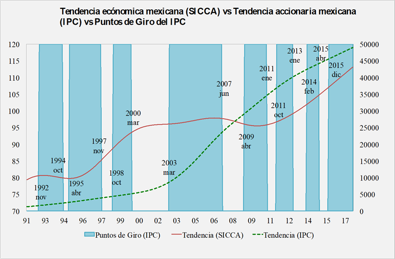 En la Figura 8 se muestra la tendencia económica mexicana obtenida a partir de la tendencia del componente coincidente del SICCA, la tendencia accionaria mexicana dada por la tendencia del IPC y se destaca en el fondo con cambios de barras los puntos de giro de los ciclos financieros del IPC.