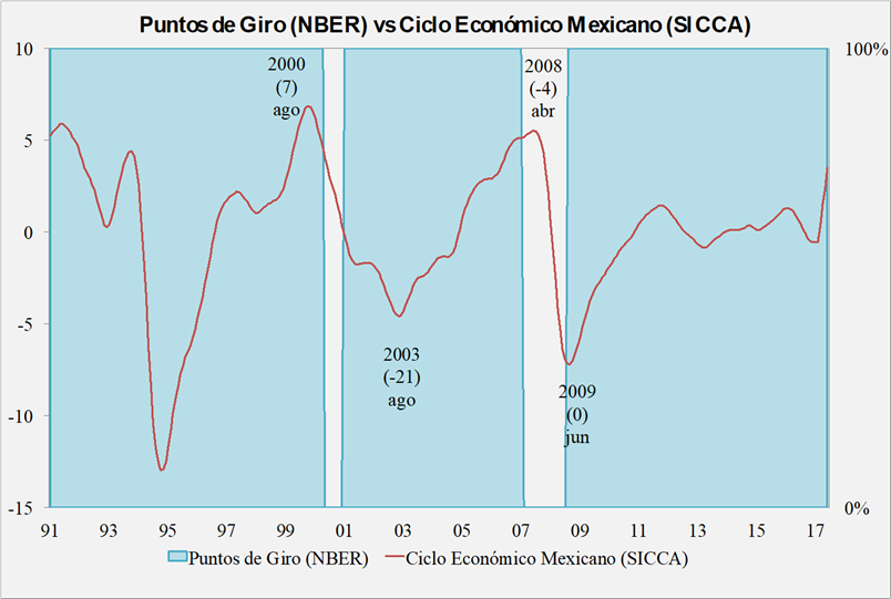 En la Figura 9 se muestran los ciclos de la económica mexicana obtenidos a partir de los ciclos del componente coincidente del SICCA, y se destaca en el fondo con cambios de barras el fechado de los ciclos económicos del NBER para los Estados Unidos.