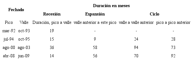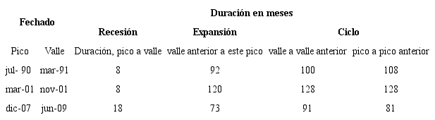 En la Tabla 2, se presenta las fechas de inicio y terminación de las fases de expansiones y recesiones en Estados Unidos de julio de 1990 a junio de 2009 definidas por el NBER.