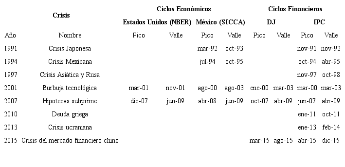 Los datos utilizados para este estudio abarcan el periodo de noviembre de 1991 a abril de 2018; para los ciclos financieros se emplearon dos indicadores de mercado, Dow Jones e IPC para Estados Unidos y México, respectivamente, los cuales son considerados como los más representativos del mercado financiero en ambos países. Para los ciclos económicos, se utilizó el índice compuesto coincidente del SICCA para México, y el fechado del NBER para Estados Unidos. Así también, se muestran las fechas de las crisis financieras más relevantes durante el periodo de estudio.
