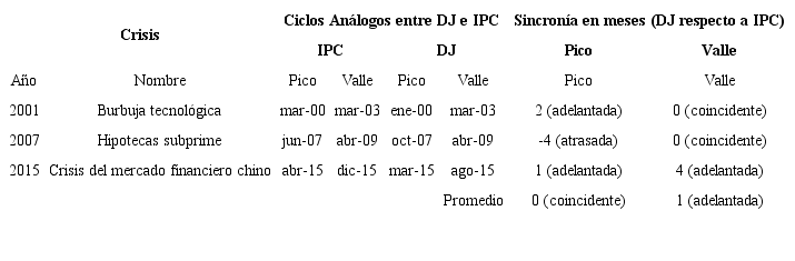 En la Tabla 4 se muestra un ejemplo de sincronía entre los ciclos análogos del índice IPC respecto a los del DJ. En particular, se observa, que en dos ocasiones, los picos del IPC se rezagaron: dos meses en la crisis de la Burbuja tecnológica y un mesen el periodo de la crisis del mercado financiero chino, por lo que se podrían considerar casi coincidentes durante estas crisis, y solo en una ocasión se adelantó cuatro meses, Hipotecas subprime. Con respecto a los valles, en dos ocasiones las fechas del punto de giro del valle en ambas series fue coincidente y en una ocasión se atrasó cuatro meses. En conclusión, se puede decir que el IPC tiene coincidencia tanto en picos como en valles con el DJ.