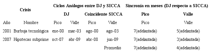 Respecto a la sincronía de los ciclos de las series accionarias versus los ciclos económicos, se encontró que en gran medida los ciclos financieros obtenidos con los índices accionarios (IPC y DJ) anticipan con al menos cuatro meses a los ciclos económicos de Estados Unidos y México, medidos a través del fechados del NBER y de los puntos de giro del SICCA, respectivamente. En cuanto al ciclo económico mexicano (SICCA) y el fechado del NBER para los ciclos de Estados Unidos presentan una baja sincronía.