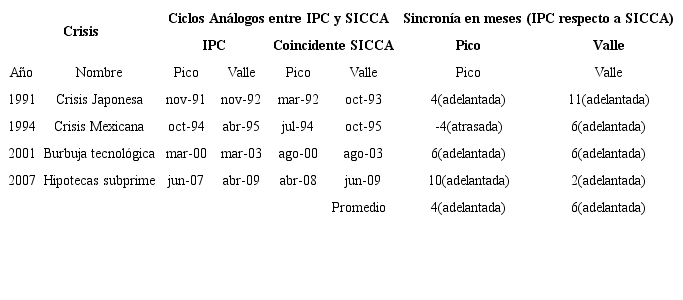 Para el análisis de ciclos, altas frecuencias, se hace uso del Filtro HP aplicado en dos ocasiones, con el objetivo de tener un filtrado pasa bandas para las series del IPC, DJ y SICCA, obteniendo así el componente ciclo, que se define como las fluctuaciones obtenidas de la diferencia entre los datos observados y su respectiva tendencia. Estas frecuencias consideran periodos mayores a seis trimestres y menores a diez años. También, se utilizan las fechas de los puntos de giro de las series financieras(IPC y DJ) y el SICCA; para el ciclo económico estadounidense se utiliza el fechado del NBER. Se muestra la sincronía en meses (coincidente, atrasada o adelantada) entre las series analizadas, con el objeto de explicar la relación entre los ciclos financieros y económicos con las crisis globales mencionadas para Estados Unidos y México.
