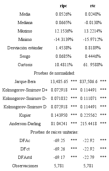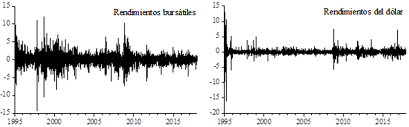 Como puede verse en la primera parte del cuadro 1, a pesar de que la volatilidad (desviación estándar no condicionada) parece haber sido mayor en el mercado bursátil durante el periodo de estudio, como lo sugiere el valor más alto de la desviación estándar no condicionada de los rendimientos bursátiles que se comentó previamente, la mayor pérdida y el mayor rendimiento durante el periodo cubierto en este análisis ocurren en los rendimientos cambiarios. Los rendimientos bursátiles muestran una mediana ligeramente superior en valor que la media y simultáneamente un sesgo positivo, lo que no cabría esperar bajo una distribución normal. También cabe destacar que tanto para los rendimientos bursátiles como para los cambiarios se puede rechazar el supuesto de una distribución normal con base en todas las pruebas cuyos resultados se reportan en la sección de pruebas de normalidad del cuadro 1.2 Se presentan en la parte final del mismo cuadro los resultados de la prueba aumentada de Dickey y Fuller con sus diferentes especificaciones y se puede decir que las dos series de rendimientos no sufren de problemas de estacionariedad.